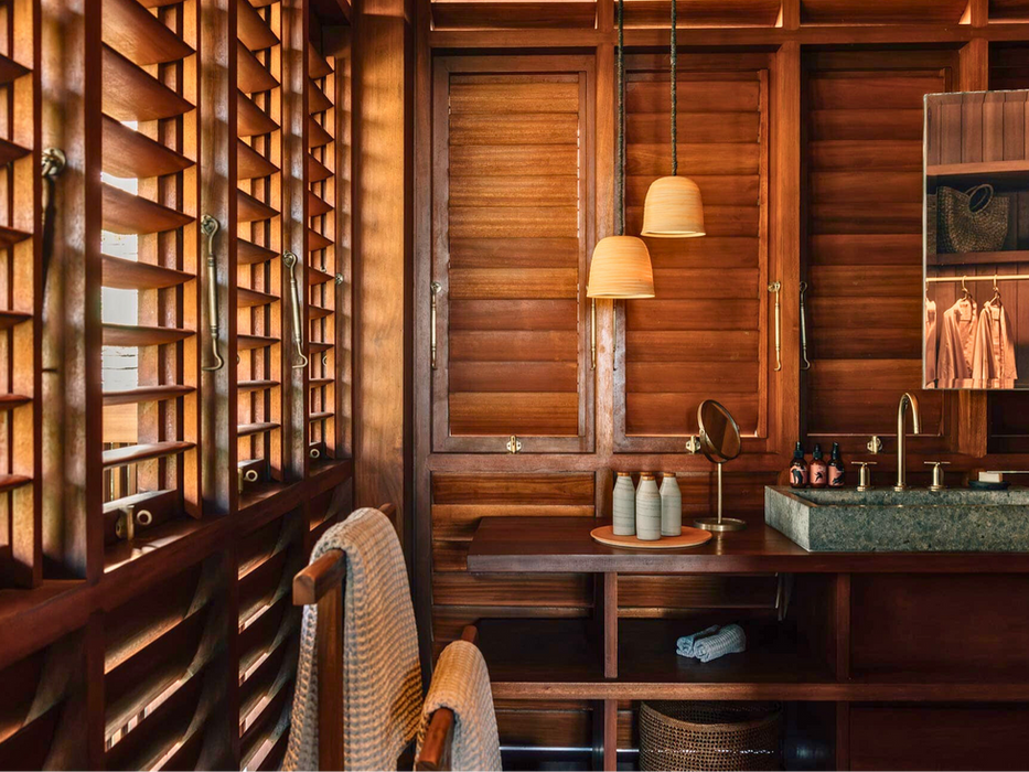 Large windows and design elements like wooden blinds in the bathrooms blend the interior with the exterior, allowing sea breezes to flow in and enhancing the connection with nature.